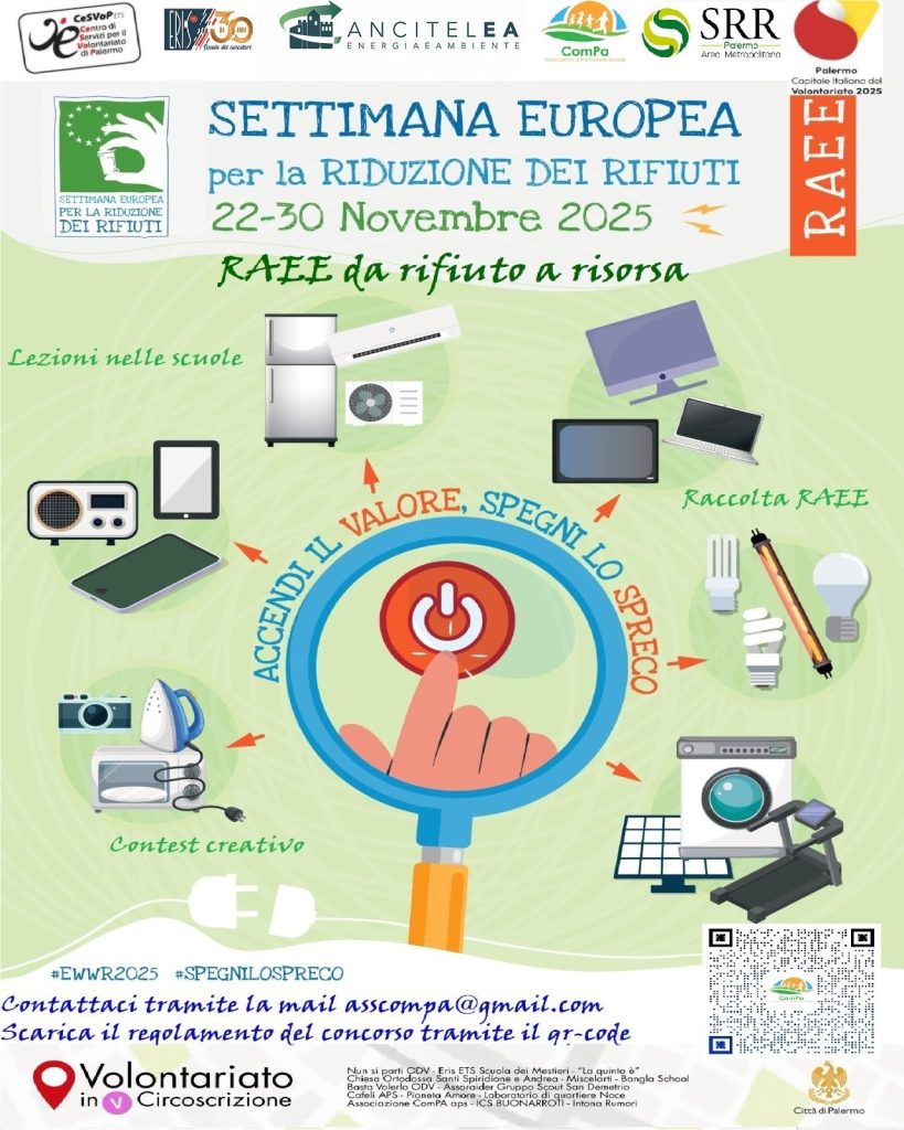 Dal 22 al 30 novembre 2025 si terrà la diciassettesima edizione della Settimana Europea per la Riduzione dei Rifiuti (SERR) dedicata quest’anno ai RAEE (rifiuti elettrici ed elettronici) con il motto “ACCENDI IL VALORE, SPEGNI LO SPRECO”. Su iniziativa del tavolo di co-progettazione della quinta circoscrizione del Comune di Palermo, facilitato dal CeSVoP che ha visto la partecipazione attiva di associazioni, parrocchie, scuole ed enti di formazione, in stretta collaborazione con il Consiglio di Circoscrizione e i Servizi Sociali di Comunità sarà programmata l’azione “RAEE da rifiuto a risorsa”.