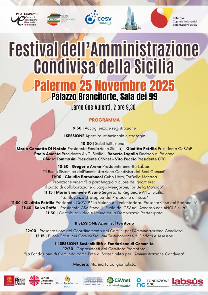 L’iniziativa, che si inserisce nel calendario di Palermo Capitale Italiana del Volontariato 2025, è promossa dal CeSVoP insieme a CSV Etneo, CESV Messina, ANCI Sicilia in collaborazione con CSVnet, Comune di Palermo, Caritas Diocesana, Forum del Terzo Settore e Fondazione Sicilia.