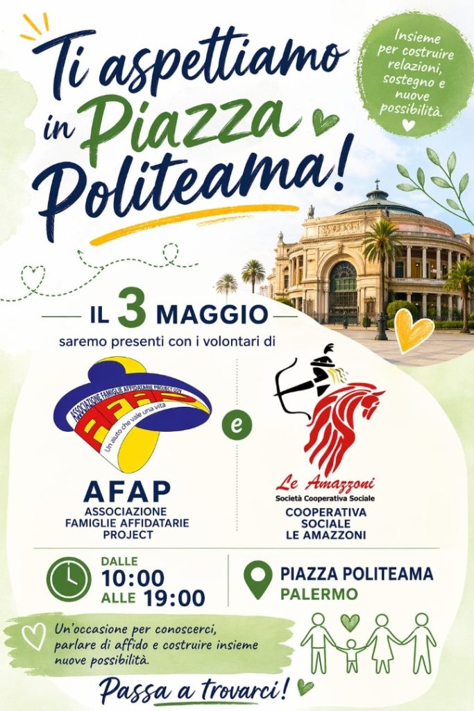 Sabato 3 maggio, dalle 10 alle 19, Piazza Politeama a Palermo si trasforma in uno spazio di incontro, dialogo e comunità. L’Associazione Famiglie Affidatarie Project (AFAP) e la Cooperativa Sociale Le Amazzoni saranno presenti con i loro volontari per avvicinare i cittadini al mondo dell’affido familiare.