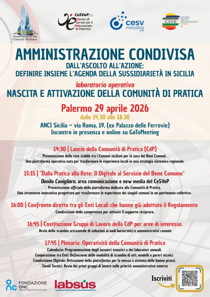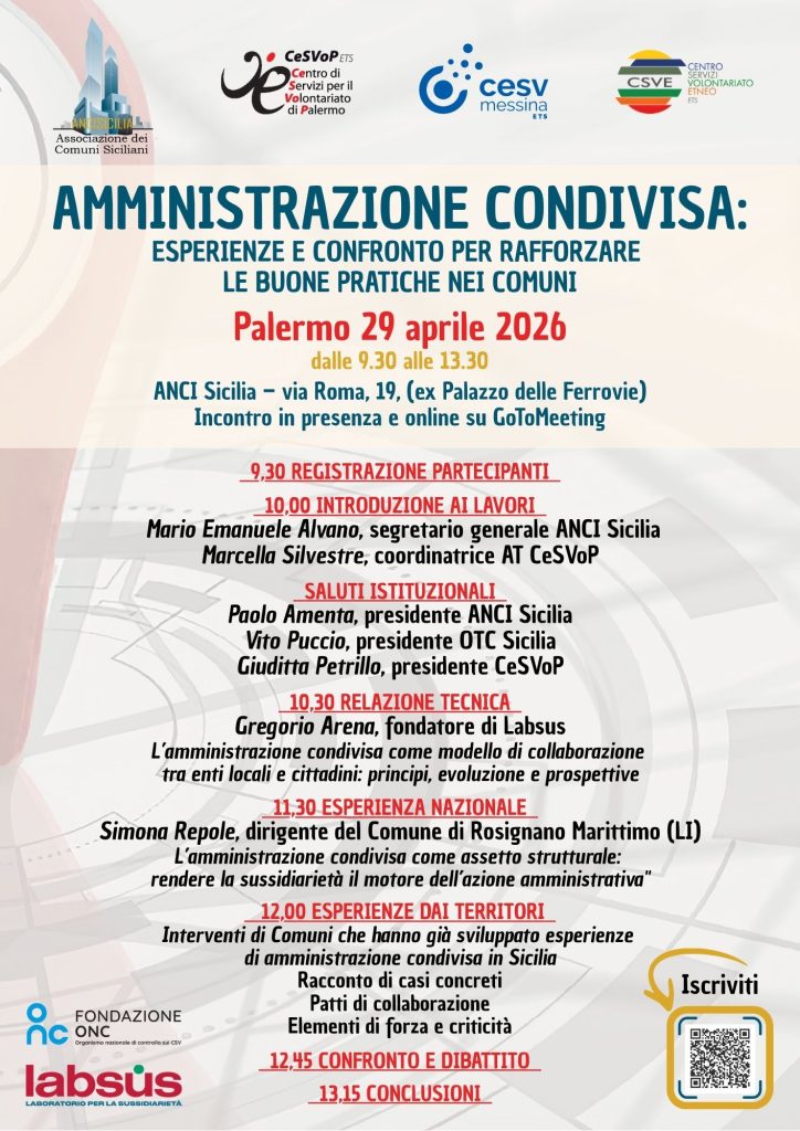 ANCI Sicilia, insieme a CeSVoP, CeSV Messina e CSV Etneo, promuove una giornata di lavoro e confronto dedicata all’Amministrazione Condivisa, in programma per mercoledì 29 aprile 2026 presso la sede di ANCI Sicilia in via Roma 19 (ex Palazzo delle Ferrovie) a Palermo (mappa). L’incontro si svolgerà sia in presenza che online su GoToMeeting.