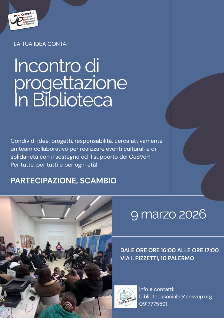 - Dove: Presso la Biblioteca sociale del CeSVoP, Via I. Pizzetti, 10 – Palermo.