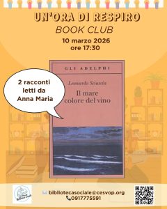 Anna Maria Sollima, che abbiamo già conosciuto per i suoi contributi culturali in biblioteca, presterà la sua voce per leggere 2 racconti autoconclusivi dalla raccolta Il mare colore del vino di Leonardo Sciascia.