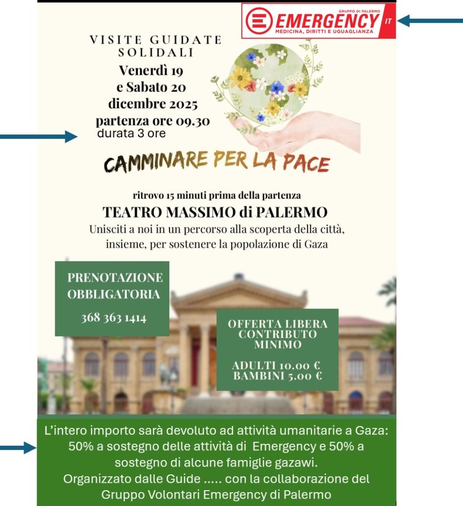 Il 19 e 20 dicembre 2025 a Palermo due giornate speciali all’insegna della solidarietà. “Camminare per la Pace” è un’iniziativa promossa da Guides for Gaza – un network di guide turistiche provenienti da tutta Italia (Sicilia, Umbria, Toscana, Lazio e Campania) – in collaborazione con il Gruppo Volontari Emergency di Palermo.