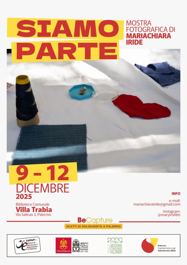 Si conclude il viaggio fotografico di BeCapture – Scatti di solidarietà a Palermo con la quarta esposizione: Un racconto per immagini di Palermo Capitale Italiana del Volontariato con lo sguardo di Maria Chiara Iride, visitabile dal 9 al 12 dicembre 2025 presso la Biblioteca Comunale Villa Trabia.