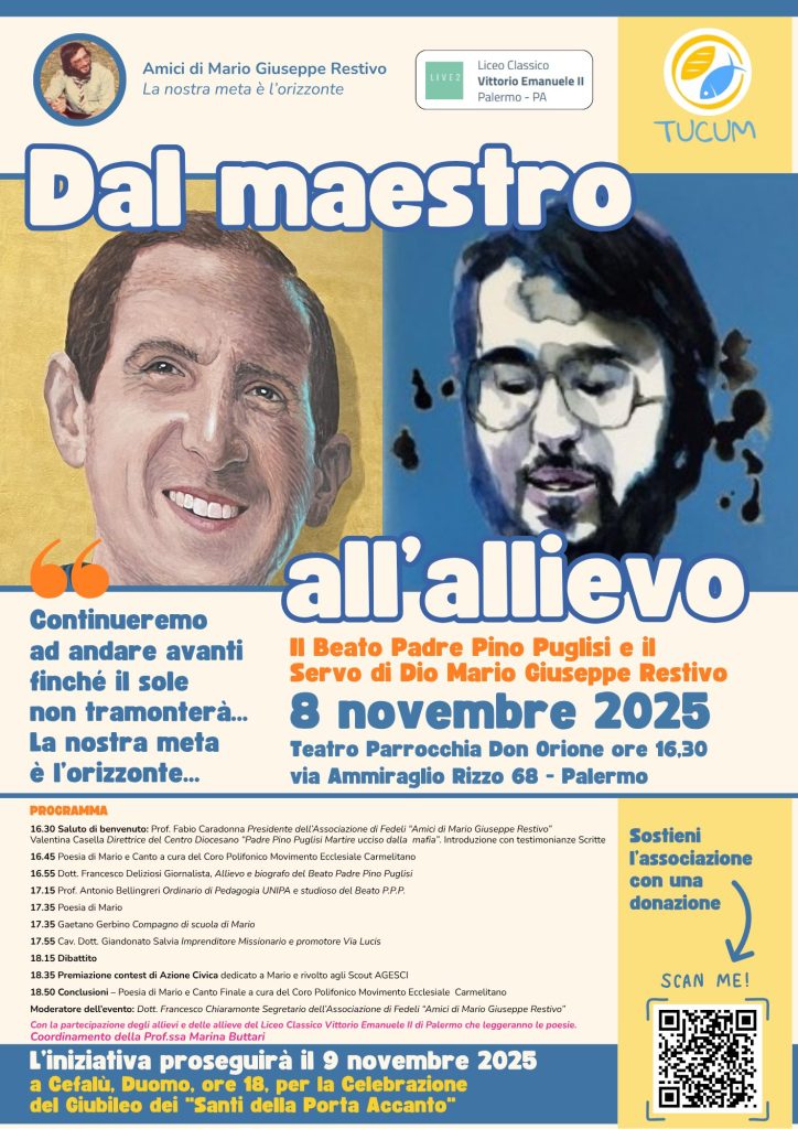 L’8 novembre 2025, alle ore 16:30, il Teatro Parrocchia Don Orione di Palermo (via Ammiraglio Rizzo 68) ospiterà l’incontro “Dal maestro all’allievo”, dedicato al legame profondo tra Mario Giuseppe Restivo e il Beato Padre Pino Puglisi, il parroco martire ucciso dalla mafia che fu suo insegnante di religione al Liceo Classico Vittorio Emanuele II.