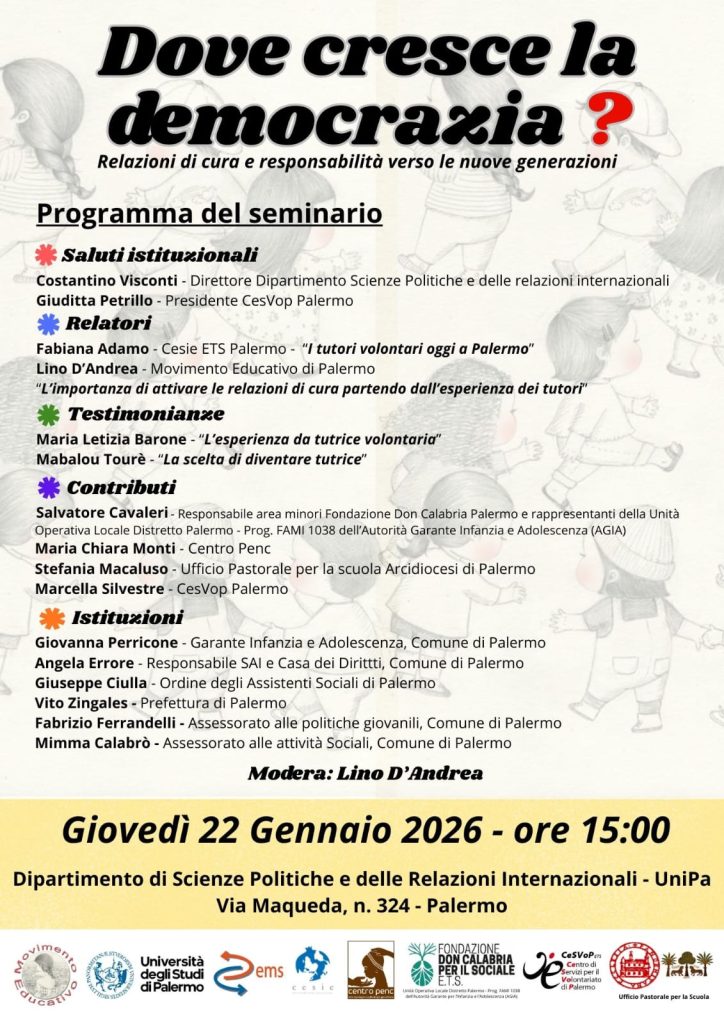 Il prossimo giovedì 22 gennaio, alle ore 15:00, l’Aula del Dipartimento di Scienze Politiche e delle Relazioni Internazionali dell’Università di Palermo (via Maqueda, 324) ospiterà un seminario dal titolo “Dove cresce la democrazia? Relazioni di cura e responsabilità verso le nuove generazioni”.