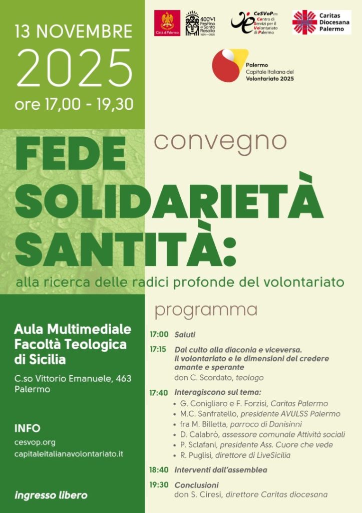 Palermo Capitale Italiana del Volontariato 2025 ci regala un nuovo momento di riflessione con un convegno dal titolo tanto ambizioso quanto necessario: “Fede, solidarietà, santità: alla ricerca delle radici profonde del volontariato”. L’appuntamento è fissato per il 13 novembre 2025, dalle 17:00 alle 19:30, presso l’aula multimediale della Facoltà Teologica di Sicilia (Corso Vittorio Emanuele, 463).