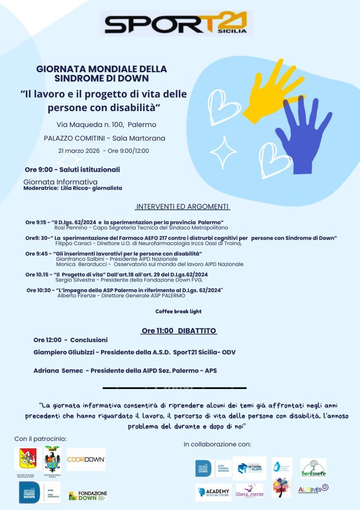 Esperti, rappresentanti delle istituzioni sanitarie e dell’AIPD (Associazione Italiana Persone Down) si confronteranno su temariche legate all’inserimento lavorativo e le nuove sperimentazioni farmacologiche, con l’obiettivo di trasformare il concetto di “assistenza” in un percorso concreto verso l’adultità e l’autonomia. Sarà anche il momento per presentare ufficialmente la neonata sezione palermitana dell’AIPD, un nuovo punto di riferimento che si unisce alla rete nazionale per sostenere le famiglie del territorio.