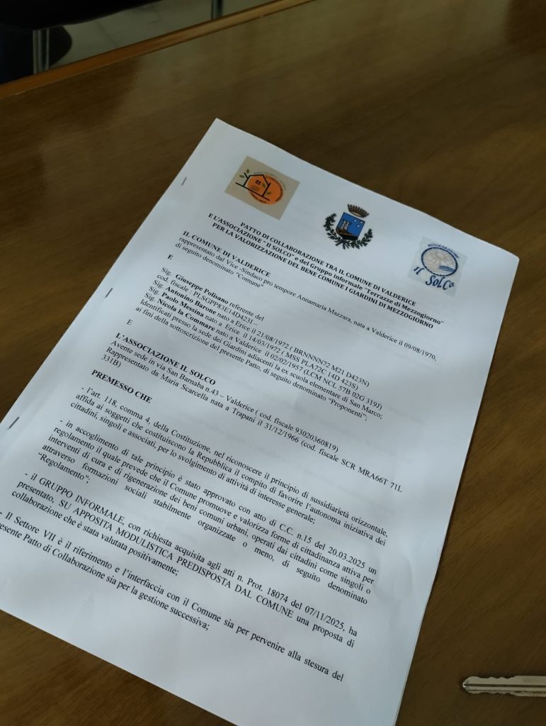 Con la recente firma del primo Patto di Collaborazione, la comunità di Valderice ha raggiunto un traguardo storico. L’accordo, siglato tra l’Amministrazione Comunale (rappresentata dal Sindaco Francesco Stabile, dal Vice Sindaco Anna Maria Mazzara e dalla Responsabile dei Servizi Sociali Laura Bondi), un gruppo di cittadini attivi e l’associazione “Il Sol.Co.”, formalizza l’impegno congiunto per la valorizzazione e la rigenerazione del bene comune “Le Terrazze di Mezzogiorno”.