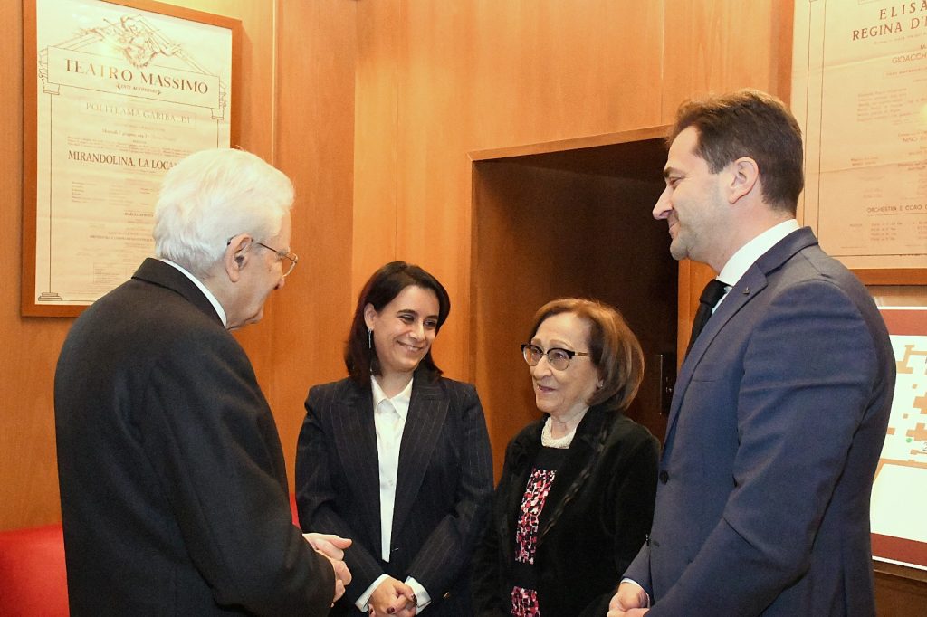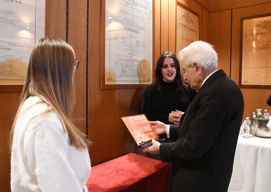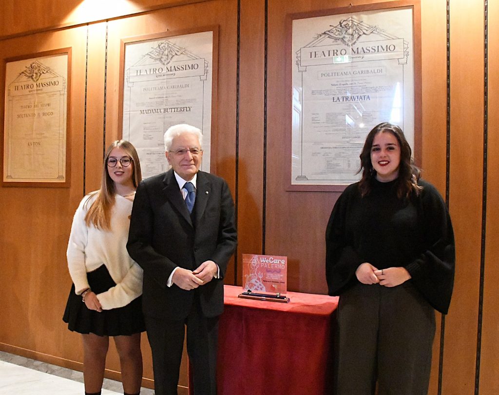 Prima di lasciare il Teatro Massimo, tra gli applausi e le note finali del coro di voci bianche diretto dal maestro Salvatore Punturo, Matilda e Chiara hanno consegnato al Presidente una targa con il logo “WeCare Palermo”, uno dei tanti eventi organizzati in questo anno speciale, con un richiamo alle parole di don Milani per simboleggiare l’impegno concreto delle nuove generazioni.