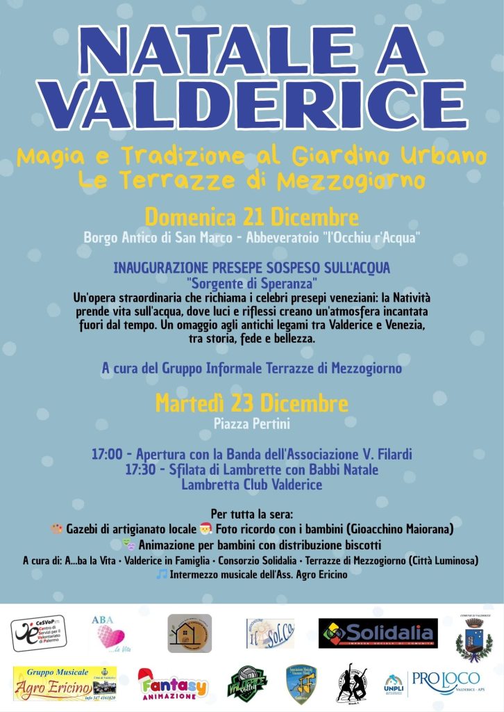 Valderice si prepara a vivere il Natale con un suggestivo programma di attività promosso dalla comunità locale. Domenica 21 e martedì 23 dicembre, il Giardino Urbano “Le Terrazze di Mezzogiorno” nel quartiere San Marco ospiterà “Natale a Valderice – Magia e Tradizione”, la prima grande iniziativa nata dalla recente firma del Patto di Collaborazione tra l’Amministrazione Comunale e la comunità locale.