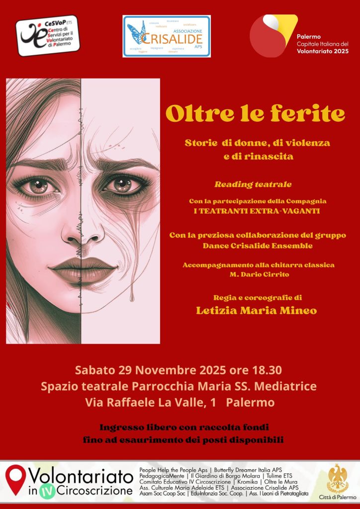 Sabato 29 novembre alle 18,30 allo Spazio teatrale della Parrocchia SS Mediatrice, Palermo, un reading teatrale che ha come temi la violenza di genere, l’affermazione dell’amore di sè e la volontà di rinascita promosso dai volontari dell’associazione Crisalide APS nell’ambito delle iniziative di Palermo Capitale Italiana del Volontariato 2025 in quarta circoscrizione.