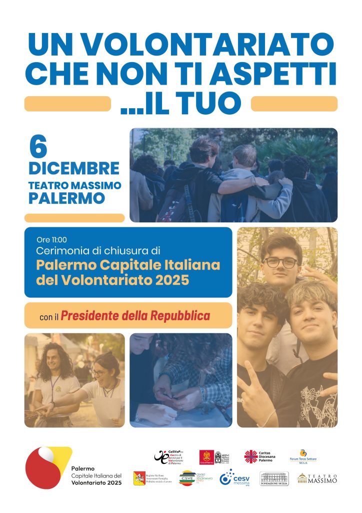 Si conclude sabato 6 dicembre, alle ore 11 al Teatro Massimo, il percorso di Palermo Capitale Italiana del Volontariato 2025. La cerimonia di chiusura si svolgerà alla presenza del Presidente della Repubblica Sergio Mattarella, di rappresentanti delle istituzioni civili e religiose, e del Terzo settore.
