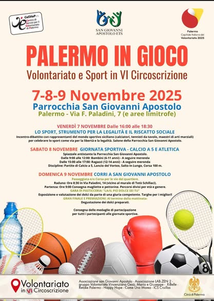 Un weekend all’insegna dello sport, del volontariato e della partecipazione cittadina. È “Palermo in Gioco”, l’iniziativa promossa dall’Associazione San Giovanni Apostolo insieme alla rete di comunità della VI Circoscrizione del Comune di Palermo, facilitata dal CeSVoP nell’ambito del calendario di Palermo Capitale Italiana del Volontariato 2025.