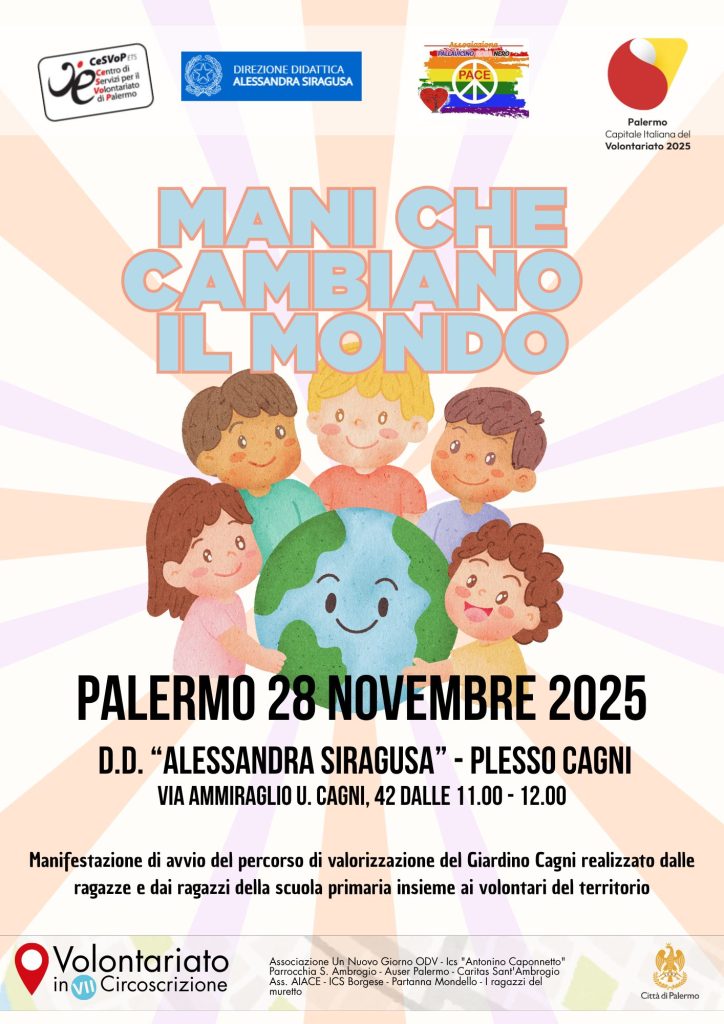 Il 28 novembre, dalle 11.00 alle 12.00, la scuola Alessandra Siragusa di Palermo inaugurerà il rinnovato Giardino Cagni, frutto del progetto “Mani che cambiano il mondo”, inserito tra le iniziative di “Palermo Capitale Italiana del Volontariato 2025”.