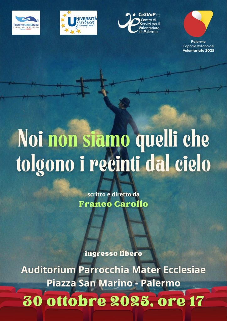 “Noi non siamo quelli che tolgono i recinti dal cielo” è il titolo dell’opera teatrale scritta e diretta da Franco Carollo che sarà parte dell’incontro. Un titolo evocativo per un lavoro che esplora il tema della solitudine e della necessità di costruire ponti, non barriere, tra le persone.