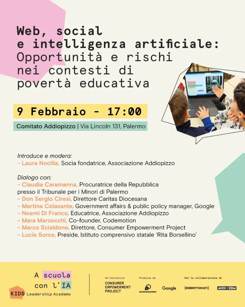 Il Comitato Addiopizzo, il 9 febbraio 2026 alle ore 17, ospita il confronto “Web, social e intelligenza artificiale: opportunità e rischi nei contesti di povertà educativa”, nell’ambito dell’iniziativa “A scuola con l’IA – Kids Leadership Academy”.