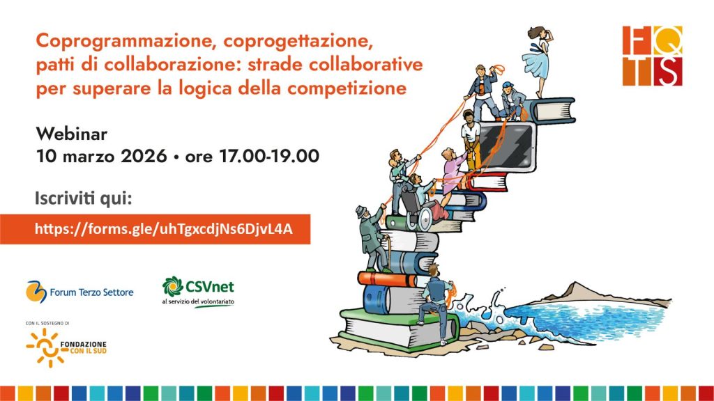 Il webinar proposto a tutti da FQTS (il percorso di formazione per i quadri del Terzo settore del Sud Italia) si concentra su tre istituti che il Codice del Terzo Settore mette a disposizione degli enti non profit e delle amministrazioni pubbliche per superare la logica della gara e dell’appalto: la coprogrammazione, la coprogettazione e i patti di collaborazione.